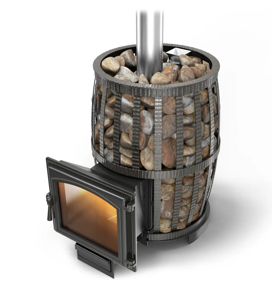 Чугунная топка в банных печах Везувий выполнена из трех элементов надежно скрепленных болтами, а герметичность соединения достигается за счет применения специального шнура из термостойкого материала и герметика. Большая масса камней аккумулирует тепло от топки. Для удержания камней вокруг топки в чугунной печи для бани предусмотрена кованная сетка в форме бочки которая удачно впишется в интерьер парного помещения. Каминная дверца наполнит комнату отдыха отблесками живого огня.