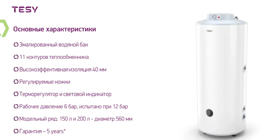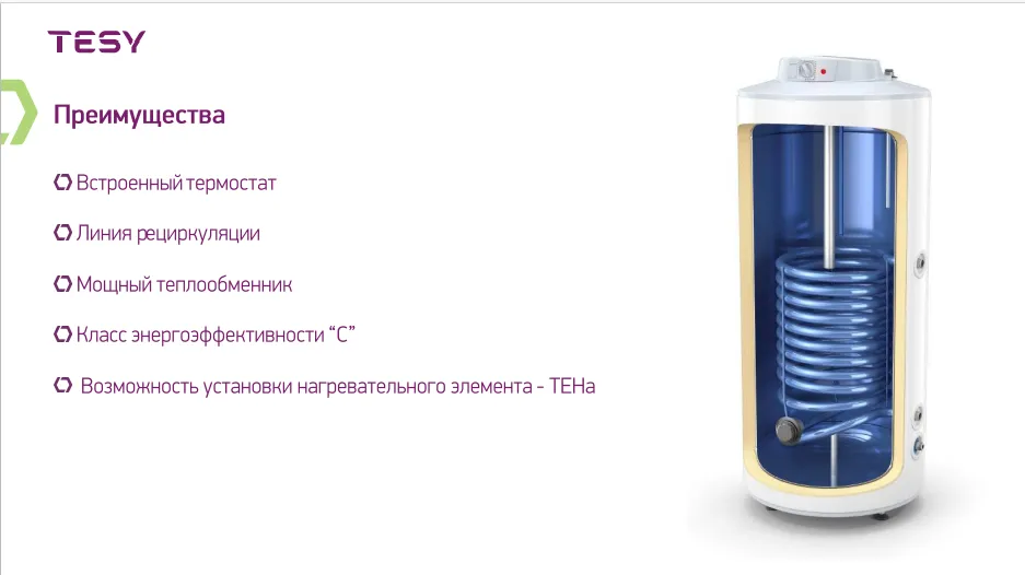 TESY MaxEau Floor 200 – бойлер косвенного нагрева на 200 литров. Модель имеет один высокоэффективный теплообменник. А биокерамическое внутреннее покрытие бака предотвращает от появления коррозии. Стоит отметить наличие терморегулятора и термостата, линии рециркуляции, возможность установки ТЭНа, а также высокий класс энергоэффективности. Данный водонагреватель является отличным выбором для нагрева воды в жилом или хозяйственном помещении.